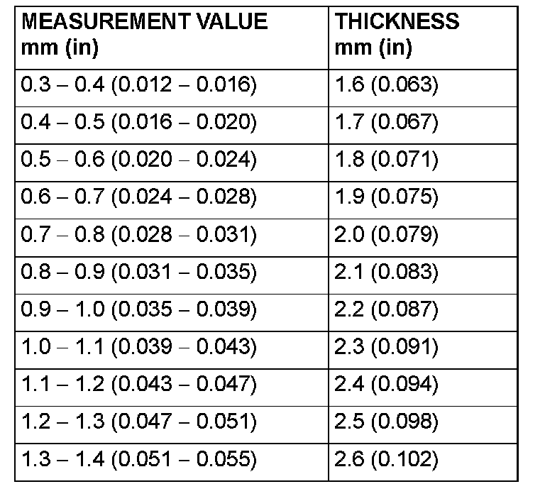 17. Select a pressure plate whose thickness corresponds to the measured amount of movement from the following table.