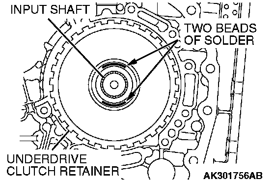 58. Place two beads of solder [each 10 mm (0.39 inch) in length, 3.5 mm (0.14 inch) in diameter] on the underdrive clutch retainer as shown in the illustration.