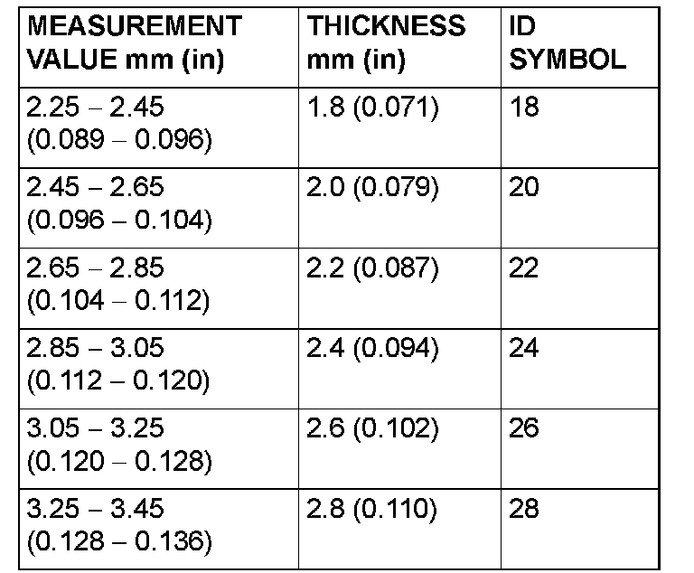 78. Use a micrometer to measure the thickness of the crushed solder beads and record the measured value. Add 0.045 to 0.105 mm (0.0018 to 0.0041 inch)* to the measured value and select a spacer with the corresponding thickness. Select the most suitable one from among those listed.