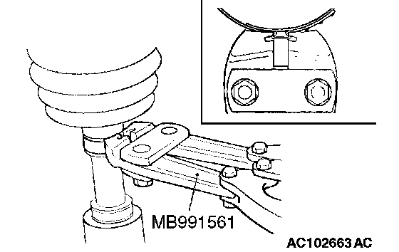 ^ Secure the drive shaft in an upright position and clamp part of the boot band to be crimped securely in the jaws of special tool MB991561.