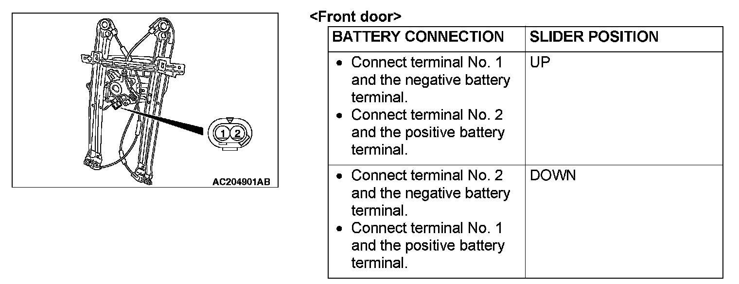 DOOR WINDOW REGULATOR CHECK1. Connect a battery directly to the motor terminals and check that the motor runs smoothly.