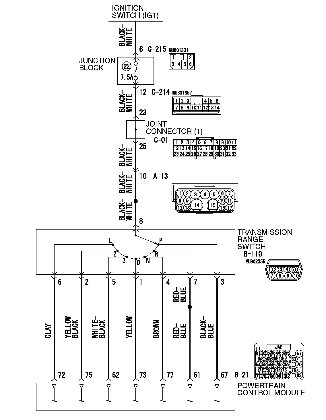 ^ Battery positive voltage is applied to the PCM (terminal 67) when the transmission range is in the "P" range. The PCM judges that the transmission range is in the "P" range when the battery positive voltage is applied.