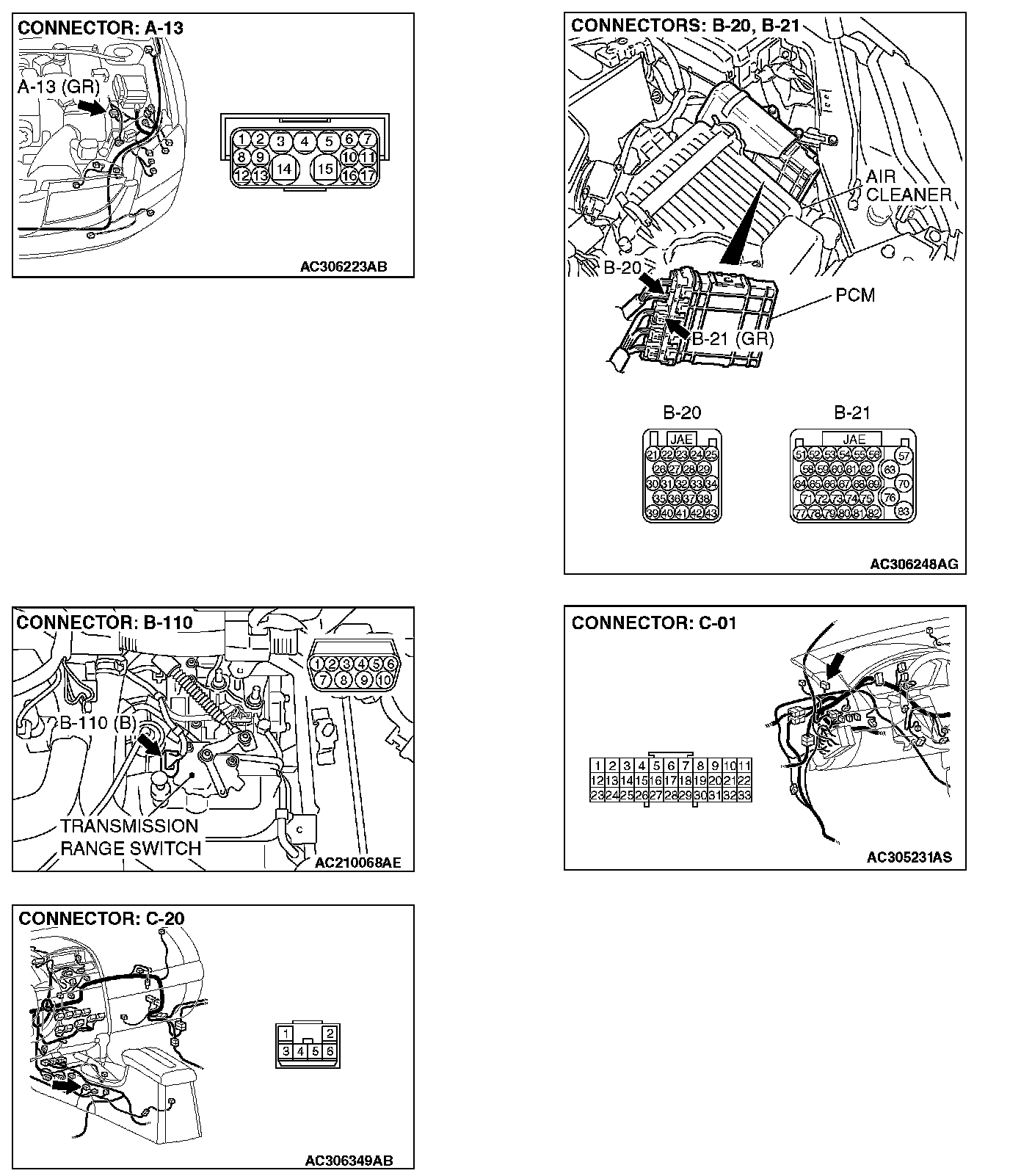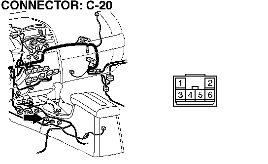 STEP 12. Check intermediate connector A-13, PCM connector B-20 and shift switch assembly connector C-20 for loose, corroded or damaged terminals, or terminals pushed back in the connector.