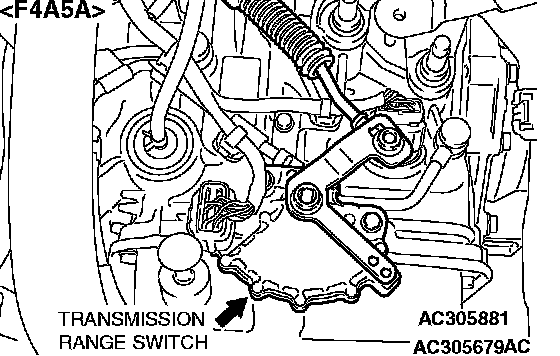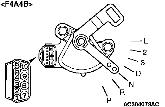 ^ Move the selector lever to "P," "R," "N," "D" and sport mode positions and confirm that the selected transmission ranges match the positions. (Sport mode is indicated as "ID" on the scan tool MB991958).