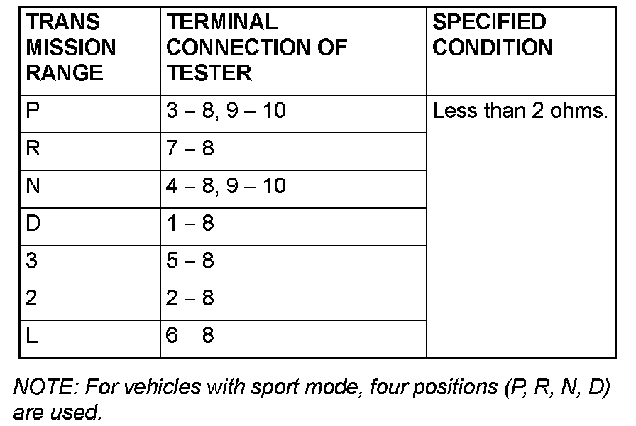 STEP 1. Check the transmission range switch. Measure the resistance between the terminals for each transmission range as indicated in the table.