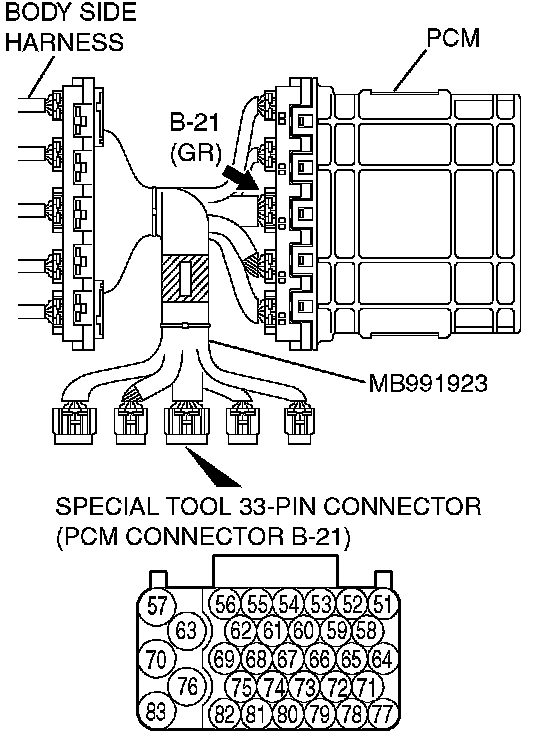 2. Connect special tool MB991923 (check harness) between the PCM and the body-side harness connector.