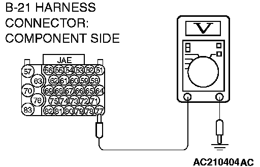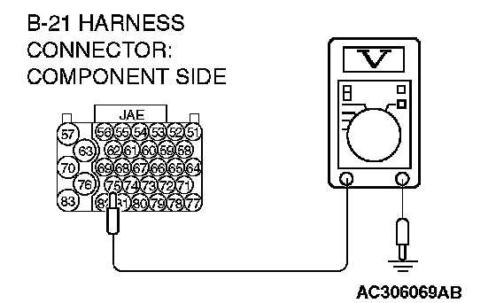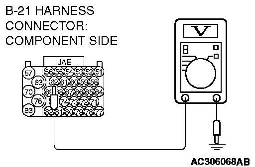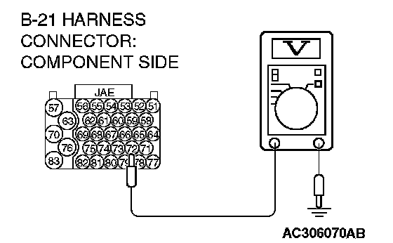 STEP 8. Measure the transmission range switch output voltage at PCM connector B-21 by using check harness special tool MB991923. ("N" position) Measure the voltage between terminal 77 and ground.