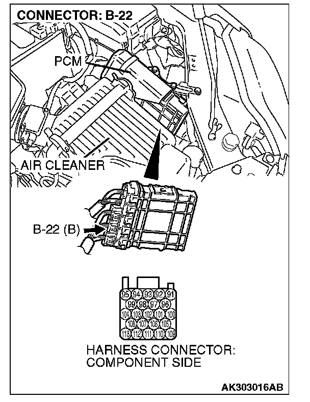 STEP 1. Check harness connector B-09 at right bank heated oxygen sensor (front) and harness connector B-22 at PCM for damage.