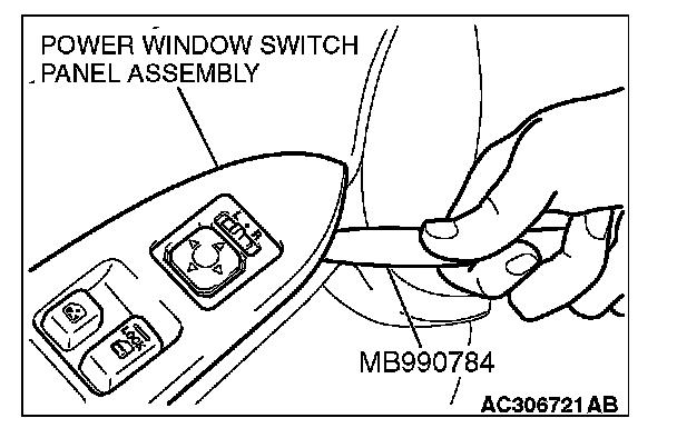 Insert special tool MB990874 as shown to remove the power window switch panel assembly.