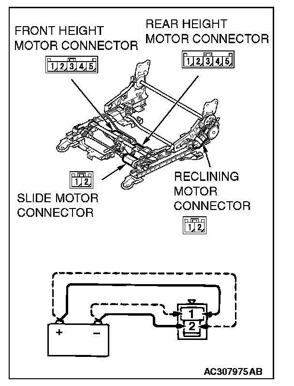 2. Connect the battery power supply to the terminal 2 and ground the terminal 1 for the front reclining side, rear slide side.