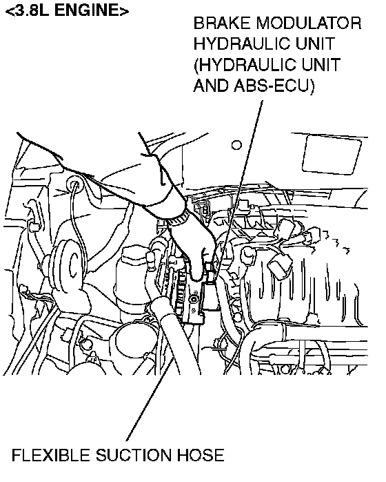 Remove the hydraulic unit as shown, taking care not to damage surrounding components such as the flexible suction hose <3.8L engine>.
