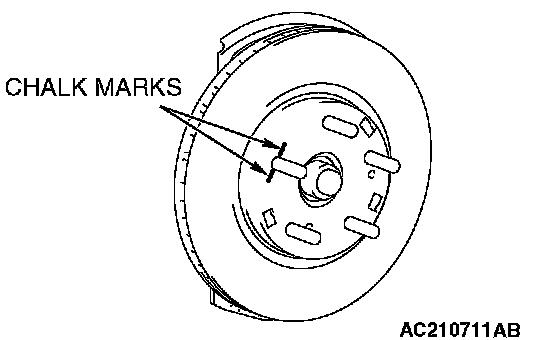 1) Chalk phase marks on the wheel stud and the brake disc as shown.