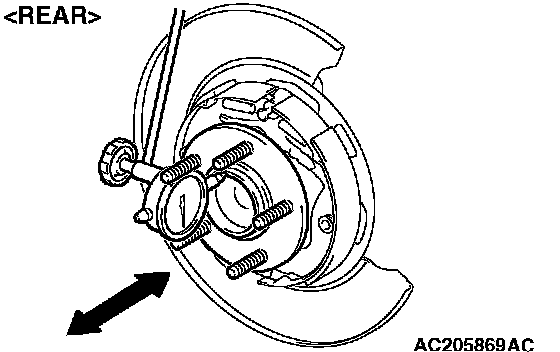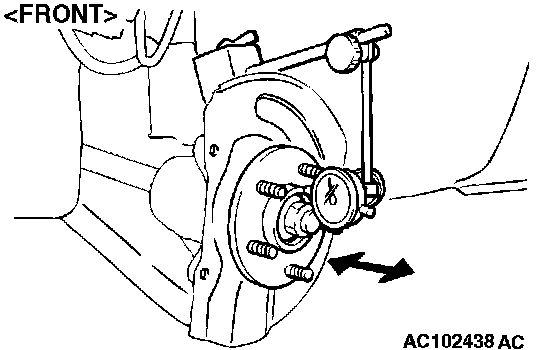 2) Remove the brake disc. Then place a dial gauge as shown, and measure the end play while moving the hub in the axial direction.
