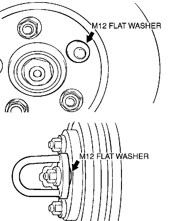 ^ When the on-the-car type lathe is used, first install a M 12 flat washer on the stud bolt in the brake disc side according to the figure, and then install the adapter. If the adapter is installed with M12 flat washer not seated, the brake disc rotor may be deformed, resulting in inaccurate grinding.
