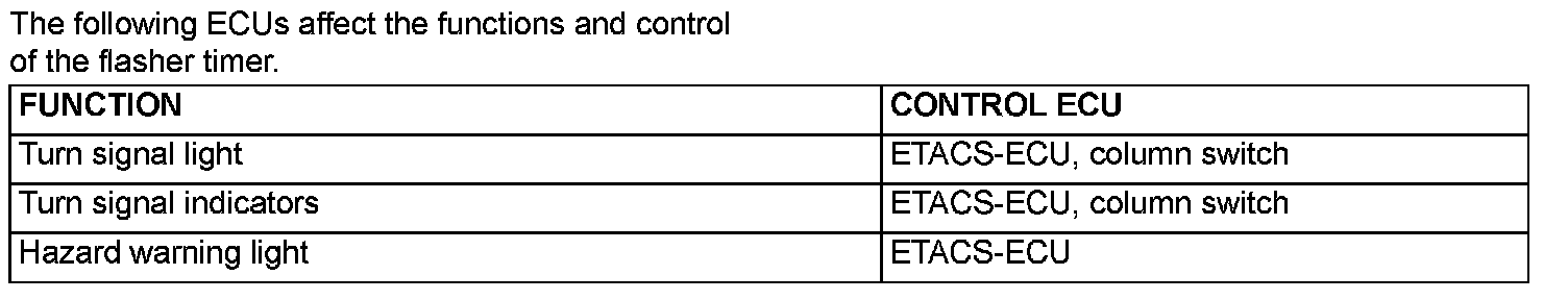 At the same time that the turn-signal lights are illuminated, the ETACS-ECU sends a signal to illuminate the turn-signal light indicator via the CAN bus line. The combination meter receives the transmitted signal and turns the turn-signal light indicator on and off.