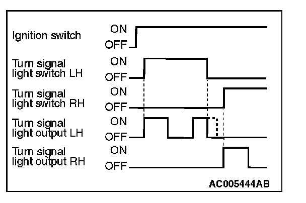 The turn signal light output (flashing signal) is turned ON when the ignition switch is ON and the turn signal light switch is ON (LH or RH). If the front turn signal light or rear turn signal light bulb has burned out, the flashing speed increases to indicate that the bulb has burned out.