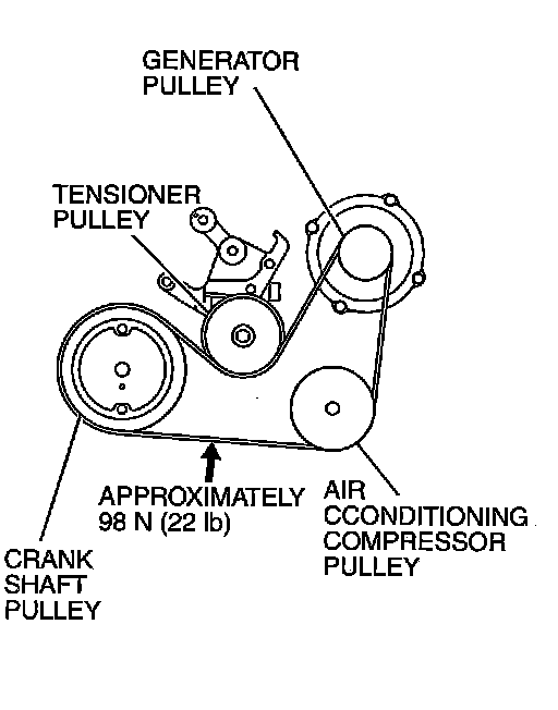 Apply approximately 98 N (22 lb) of force to the middle of the drive belt between the pulleys (at the place indicated by the arrow) and check that the amount of deflection in within the standard value.