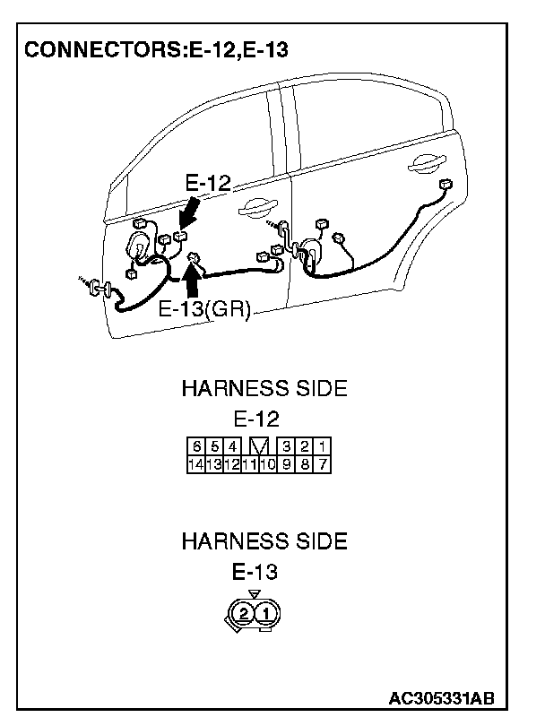 STEP 1. Check power window main switch connector E-12 and front power window regulator motor (LH) connector E-13 for loose, corroded or damaged terminals, or terminals pushed back in the connector.