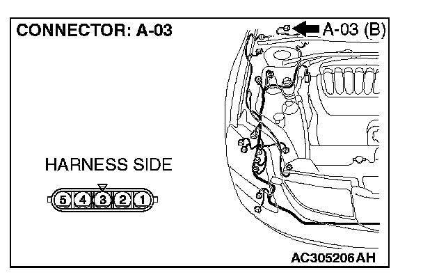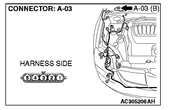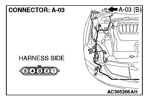STEP1. Check windshield wiper motor connector A-03 for loose, corroded or damaged terminals, or terminals pushed back in the connector.
