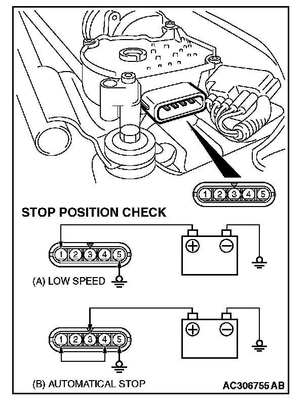 2. Connect the vehicle battery to the windshield wiper motor connector as shown, and operate the windshield wiper at low speed. While the windshield wiper is working, disconnect the battery at positions other than the predetermined park position to stop the windshield wiper motor.
