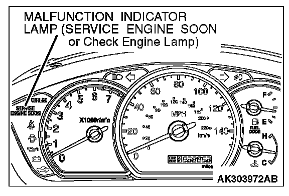 NOTE: If the Malfunction Indicator Lamp (SERVICE ENGINE SOON or Check Engine Lamp) illuminates because of a malfunction of the powertrain control module (PCM), communication between the scan tool MB991958 (MUT-III sub assembly) and the PCM is impossible In this case, the diagnostic trouble code cannot be read.