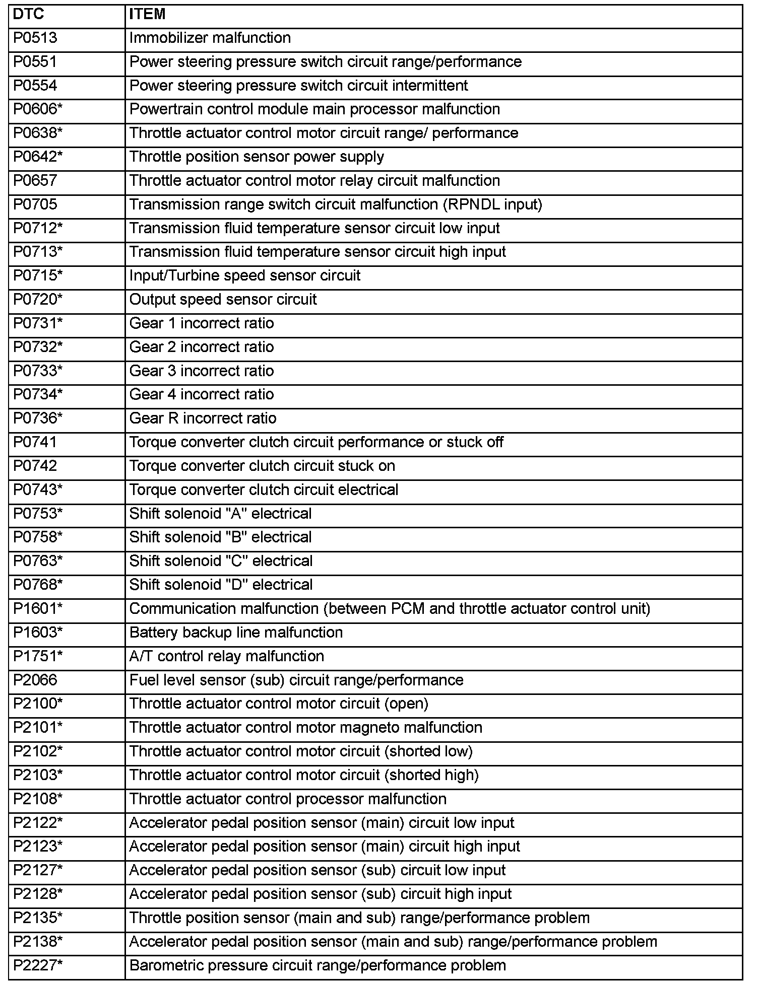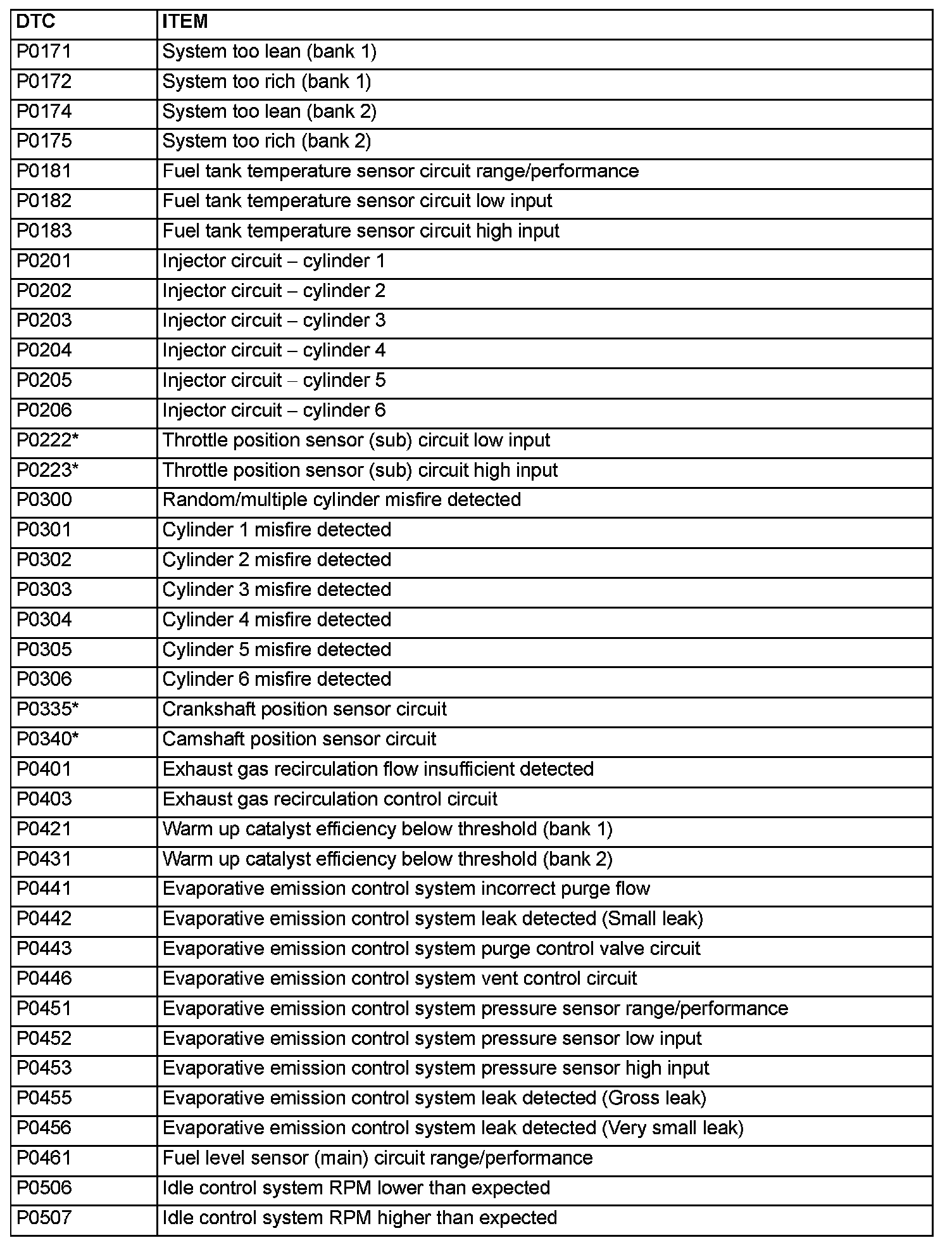 NOTE: After the PCM has detected a malfunction, the Malfunction Indicator Lamp (SERVICE ENGINE SOON or Check Engine Lamp) illuminates when the engine is next turned on and the same malfunction is re-detected However, for items marked with a "*" in the DTC NO column, the Malfunction Indicator Lamp (SERVICE ENGINE SOON) illuminates only on the first detection of the malfunction.