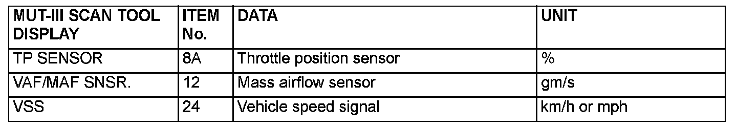 NOTE: If the sensor connector is disconnected with the ignition switch turned on, the diagnostic trouble code is memorized. In this case, send the diagnostic trouble code erase signal to the PCM in order to erase the diagnostic memory. The 126 diagnostic items are all indicated sequentially from the smallest code number. The PCM records the engine operating condition when the diagnostic trouble code is set. This data is called "Freeze-frame" data. This data can be read by using the scan tool, and can then be used in simulation tests for troubleshooting Data items are as shown: