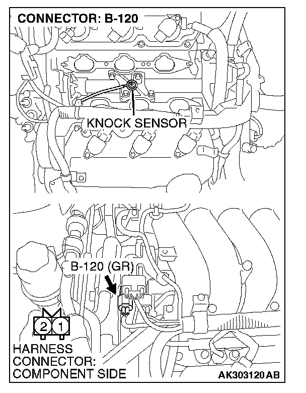 1. The ignition timing should retard more when knock sensor connector B-120 is disconnected than when it is connected.