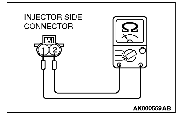3. Measure the resistance between injector side connector terminal No. 1 and No. 2.
