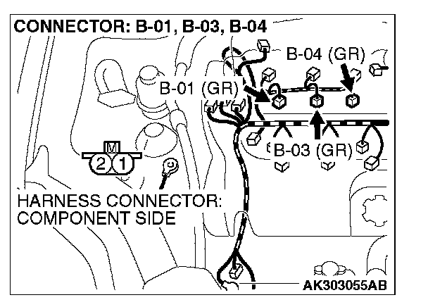 STEP 11. Check harness connector B-03 or B-04 or B-01 at right bank injector for damage.