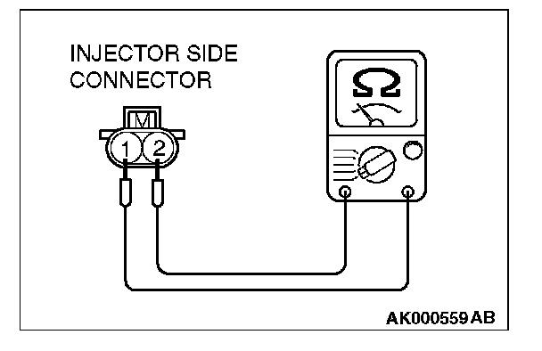 3. Measure the resistance between injector side connector terminal No. 1 and No. 2.