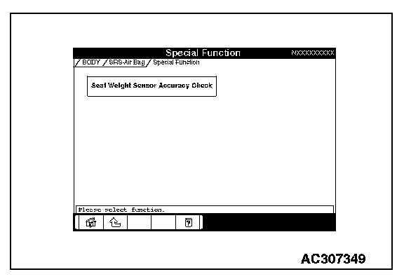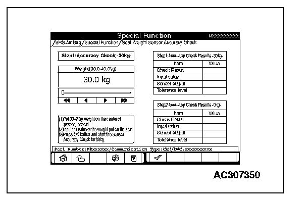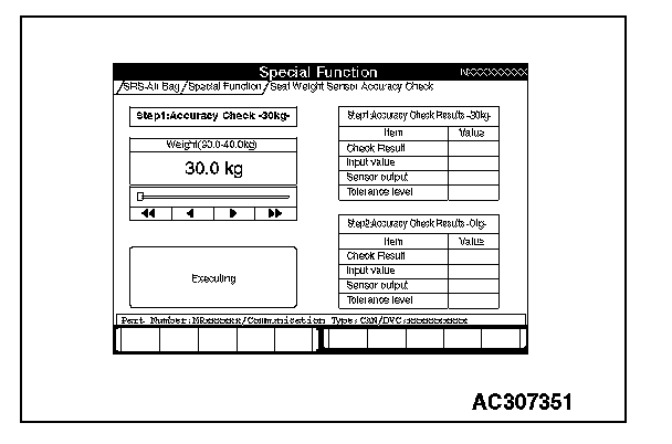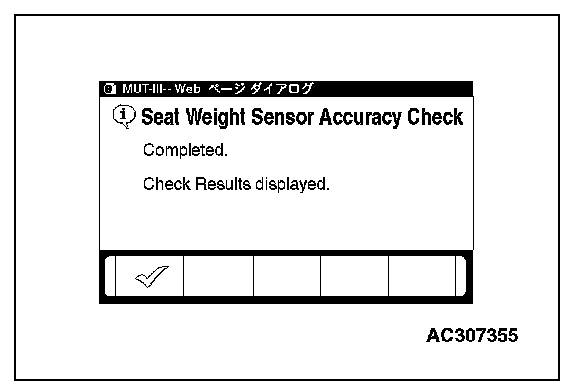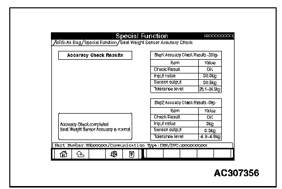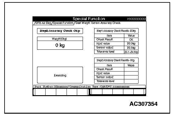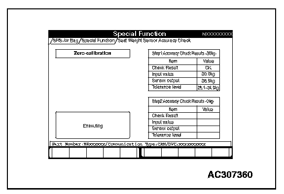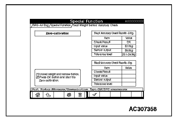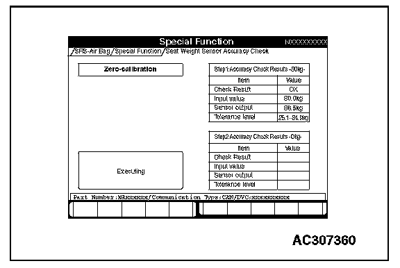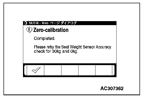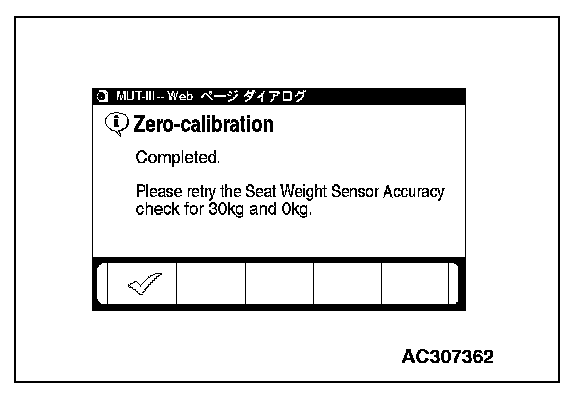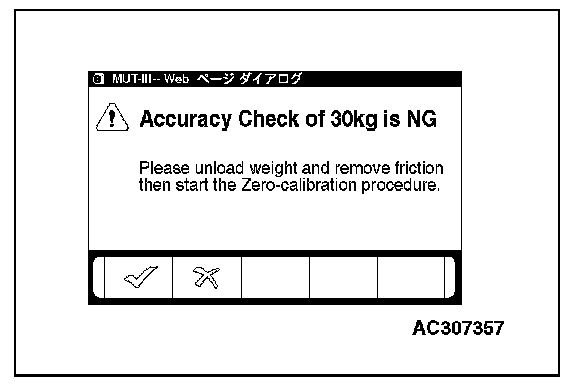 NOTE: When the screen for the accuracy check of 0 kg (0 pound) is displayed, go to step (9). If the abnormal condition is displayed, check the seat installation condition. If the seat is improperly installed, install it properly and carry out the operation in step (4) again.