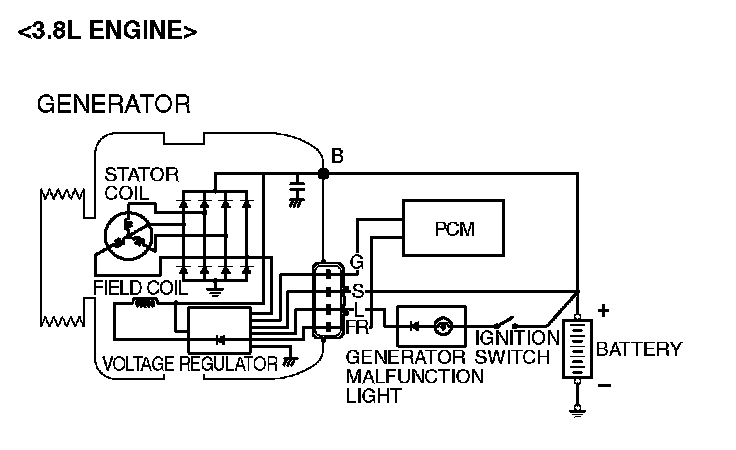 The generator output voltage rises as the field current increases and it falls as the field current decreases. When the battery positive voltage (generator S terminal voltage) reaches a regulated voltage of approximately 14.4 V, the field current is cut off. When the battery positive voltage drops below the regulated voltage, the voltage regulator regulates the output voltage to a constant level by controlling the field current.