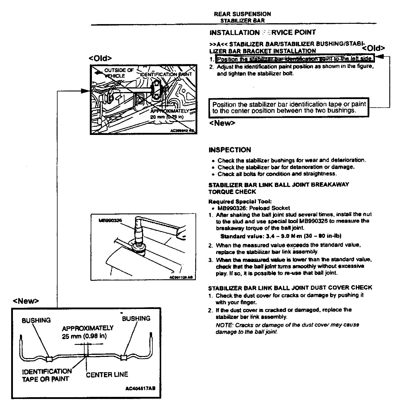 Procedures for installing the rear stabilizer bar are incorrect in the affected service manual pages. This bulletin contains corrected installation procedures.