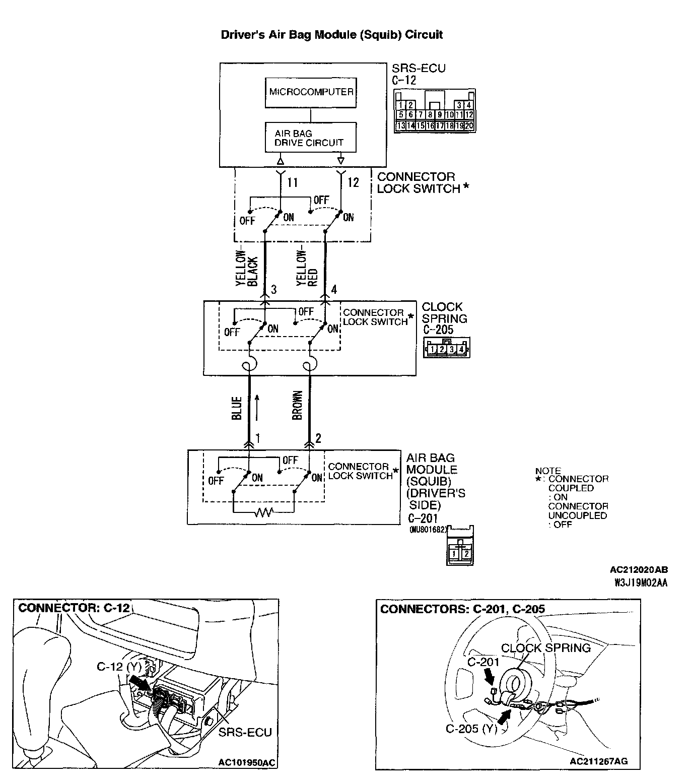 NOTE: *: The squib circuit connectors integrate a "short" bar (which prevents the air bag from deploying unintentionally due to static electricity by shorting the positive wire to the ground wire in the squib circuit when the connectors are disconnected). Therefore, if connector C-12, C-205 or C-201 is damaged or improperly engaged, the short bar may not be released when the connector is connected.