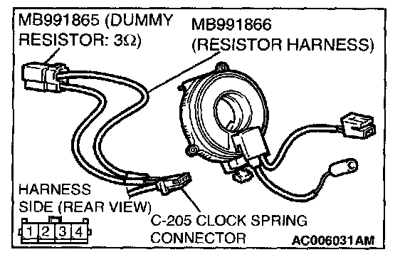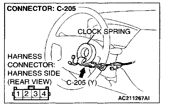4. Insert special tool MB991866 into clock spring harness side connector C-205 (terminal No.3 and 4) by backprobing.