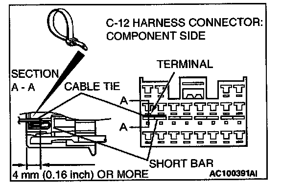 3. Insert a cable tie [3 mm (0.12 inch) wide, 0.5 mm (0.02 inch) thick in between terminals 11,12 and the short bar to release the short bar.