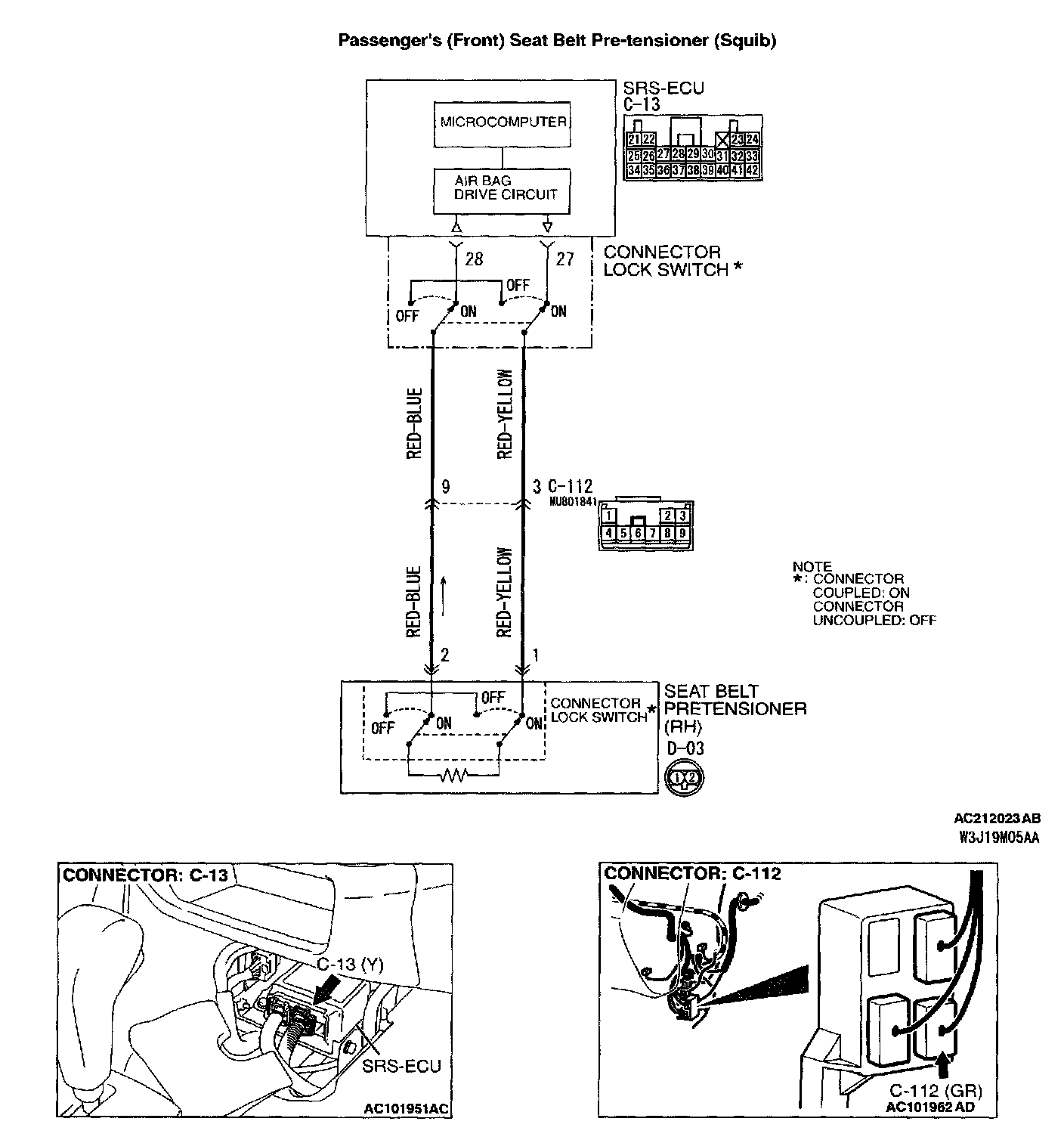 NOTE *: The squib circuit connectors integrate a "short" bar (which prevents the seat belt pre-tensioner from deploying unintentionally due to static electricity by shorting the positive wire to the ground wire in the squib circuit when the connectors are disconnected). Therefore, if connector C-13 or D-03 is damaged or improperly engaged, the short bar may not be released when the connector is connected.