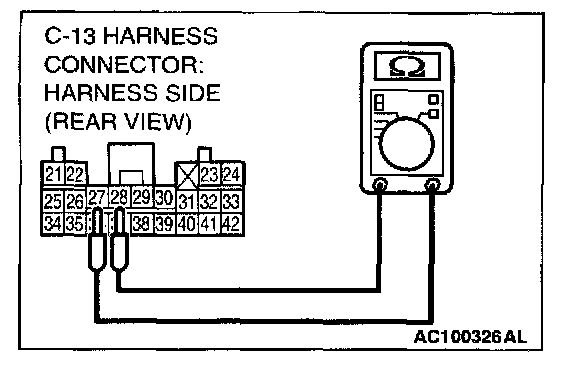4. Check for continuity between C-13 harness connector terminals 27 and 28. It should be open circuit.