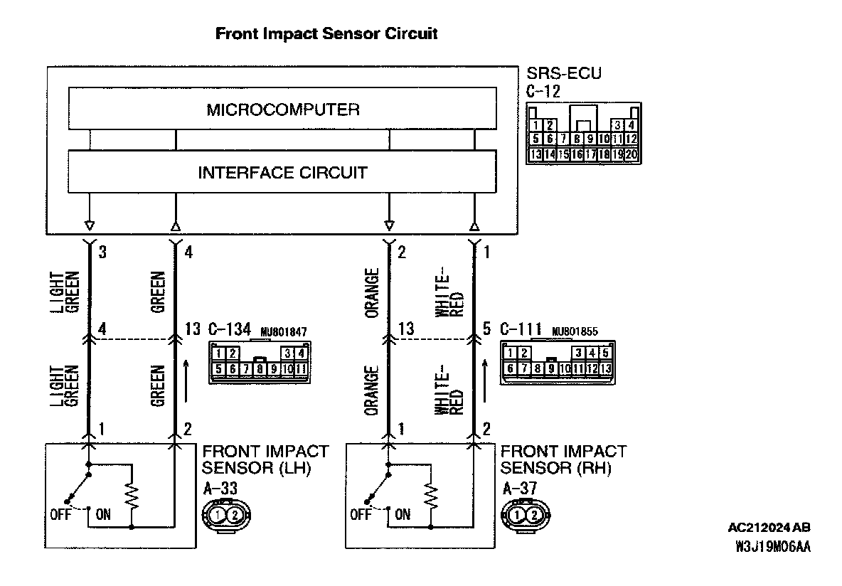 - When the left and right front impact sensors detect a collision, the switches inside the sensors turn ON.
