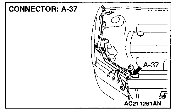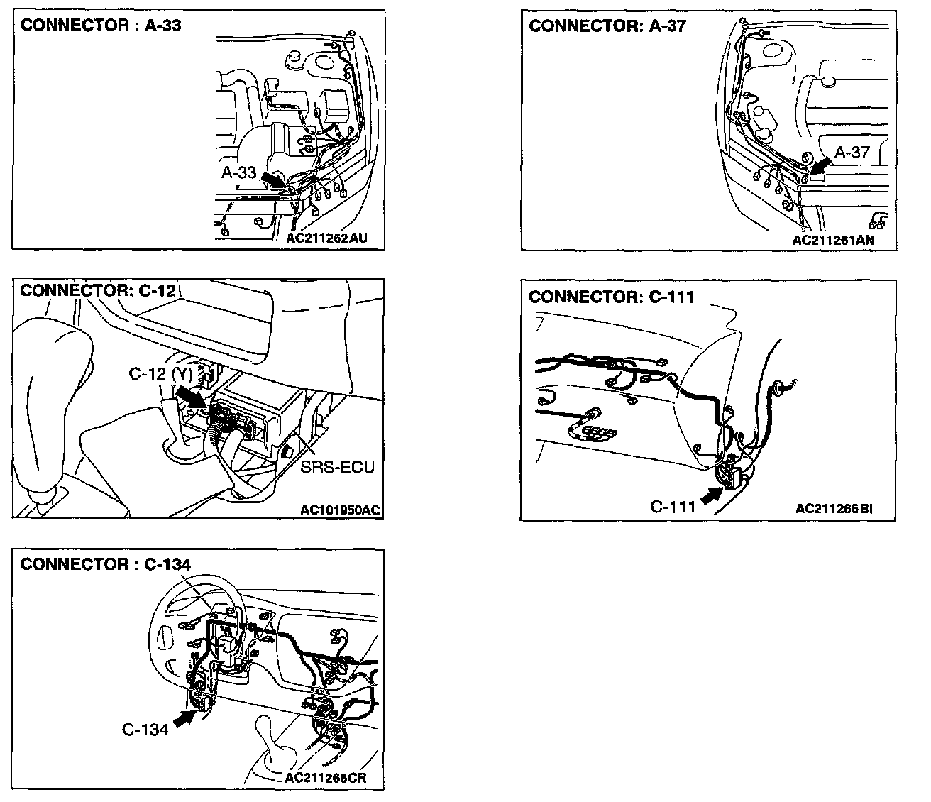 STEP 3. Check the wiring harness between the right front impact sensor connector A-37 (terminals 1 and 2) and SRS-ECU connector C-12 (terminals 1 and 2) as well as between left front impact sensor connector A-33 (terminals 1 and 2) and SRS-ECU connector C-12 (terminals 3 and 4).