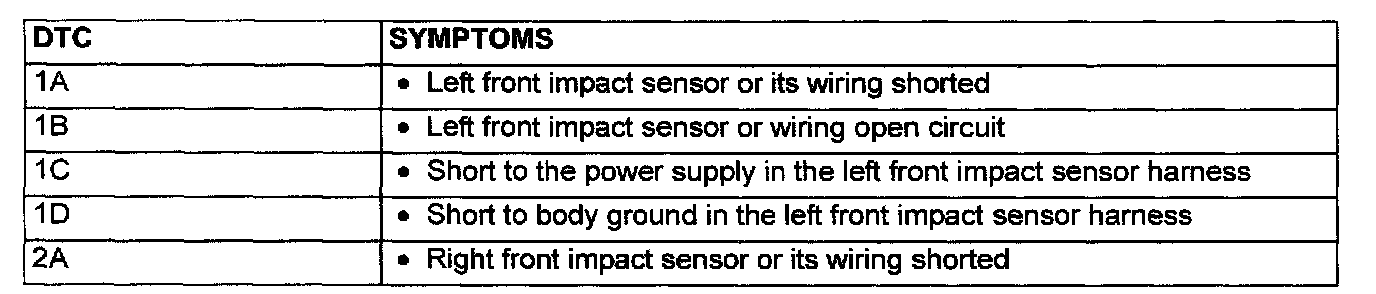 These DTCs are set if these are abnormal resistance between the input terminals of the front impact sensors.