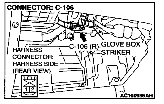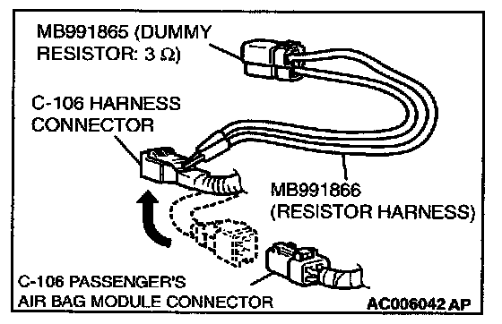 4. Disconnect the passenger's air bag module connector C-106, and insert special tool MB991866 into the harness connector by backprobing.