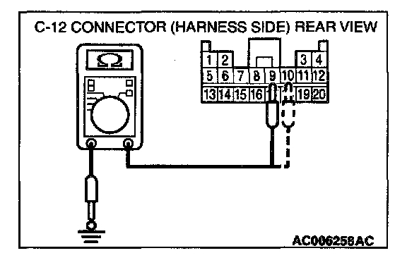 4. Check for continuity between C-12 harness connector terminals 9, 10 and body ground.