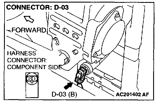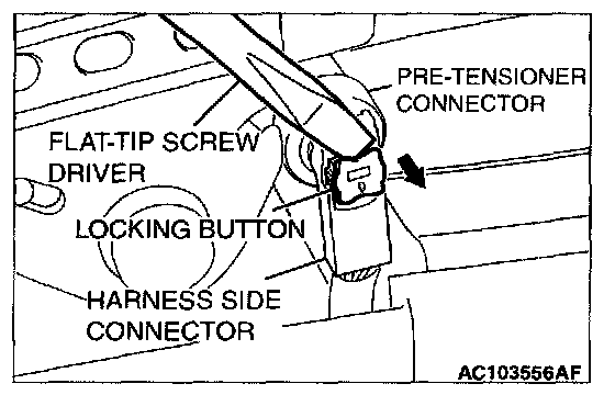 2. Disconnect passenger's seat belt pre-tensioner connector D-03. Use a flat-tipped screwdriver to unlock the locking button at the harness side connector by withdrawing it toward you in two stages, and then disconnect the connector.