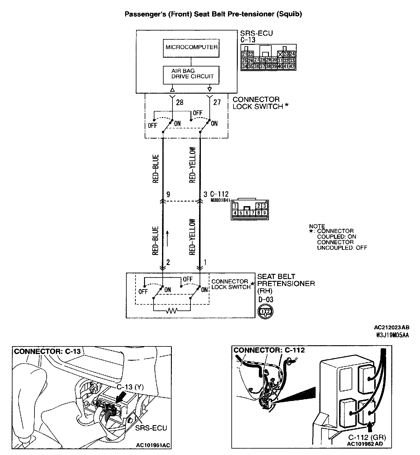 STEP 3. Check the harness wires for short circuit to power supply between SRS-ECU connector C-13 (terminal No.27 and 28) and passenger's seat belt pre-tensioner connector D-03 (terminal No.1 and 2).