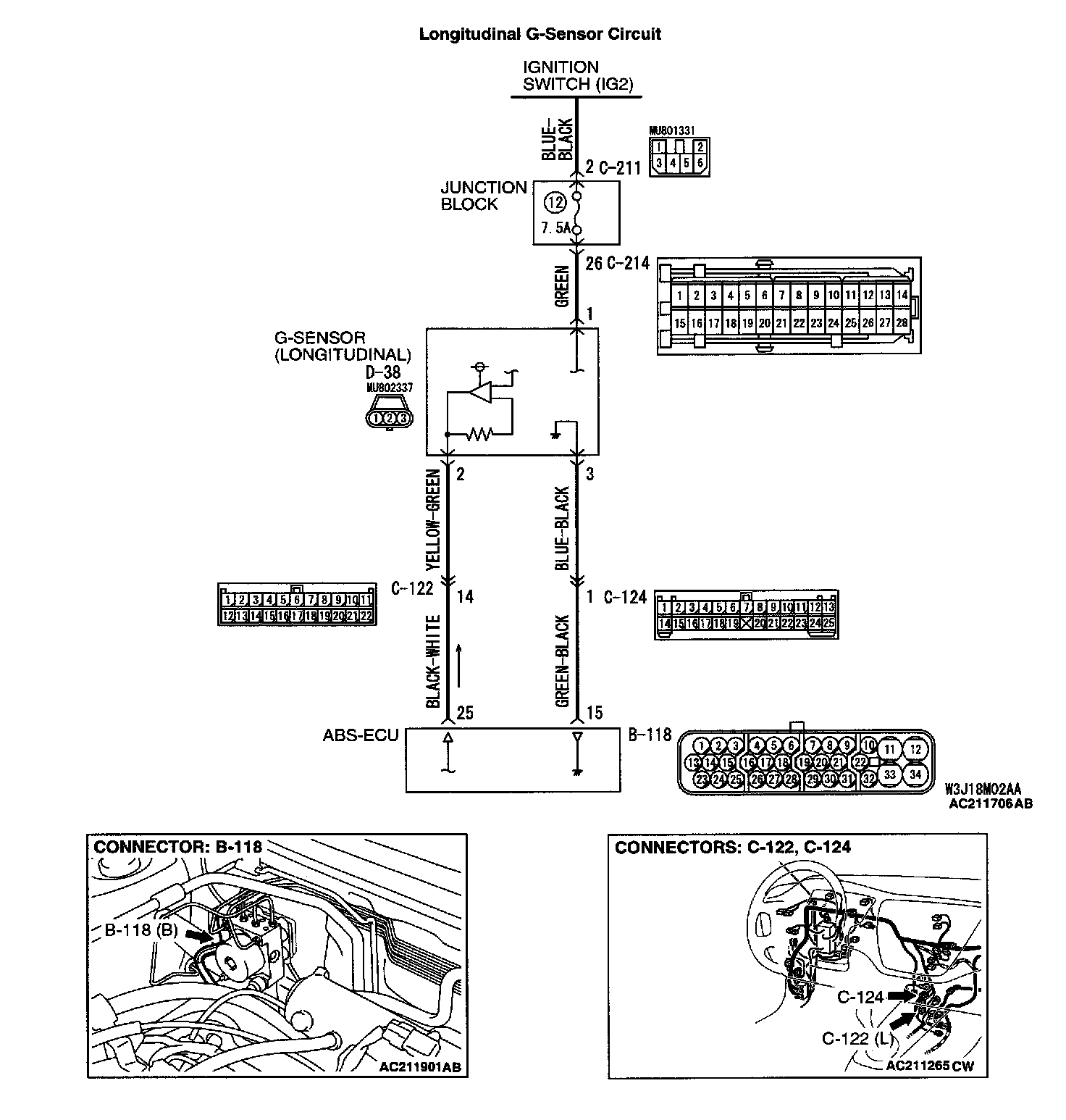 ^ The wire between longitudinal G-sensor connector D-38 (terminal 2) and ABS-ECU connector B-118 (terminal 25)