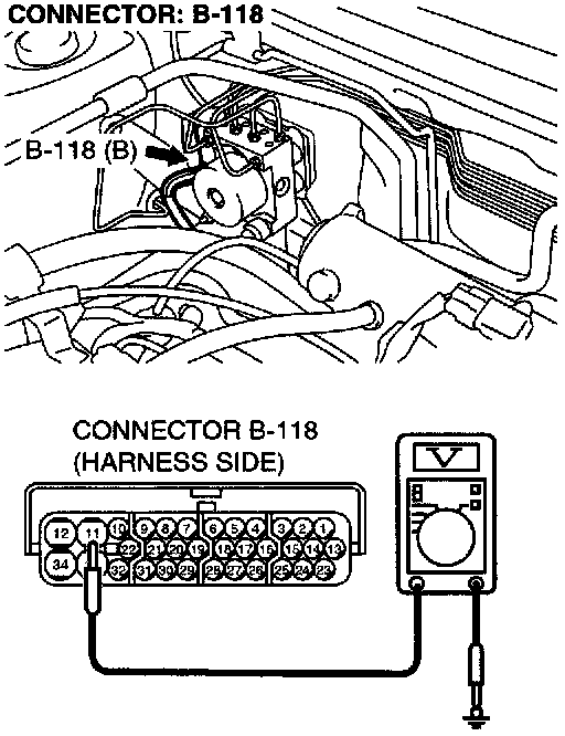 STEP 1. Check the solenoid valve or motor power supply circuit. Measure the voltage at ABS-ECU connector B-118.