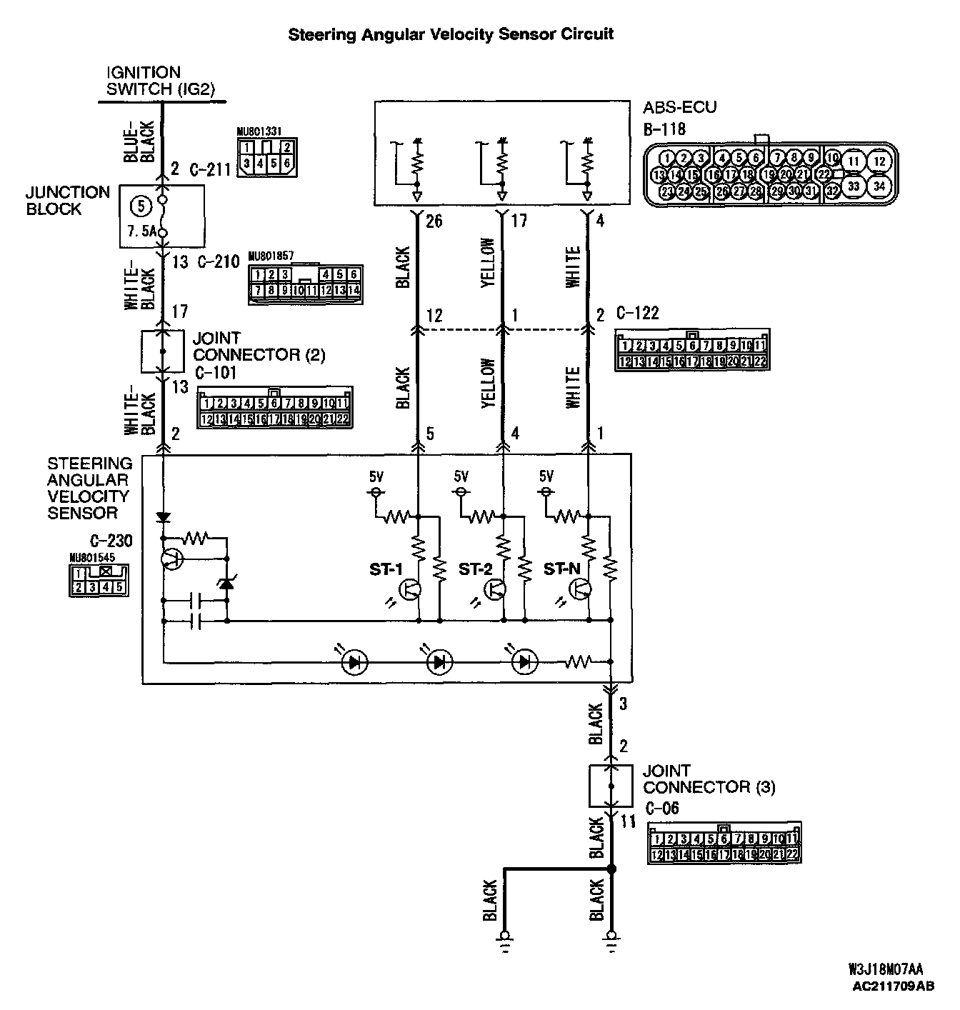 ^ The wire between steering angular velocity sensor connector C-230 (terminal 2) and junction block connector C-211 (terminal 2)