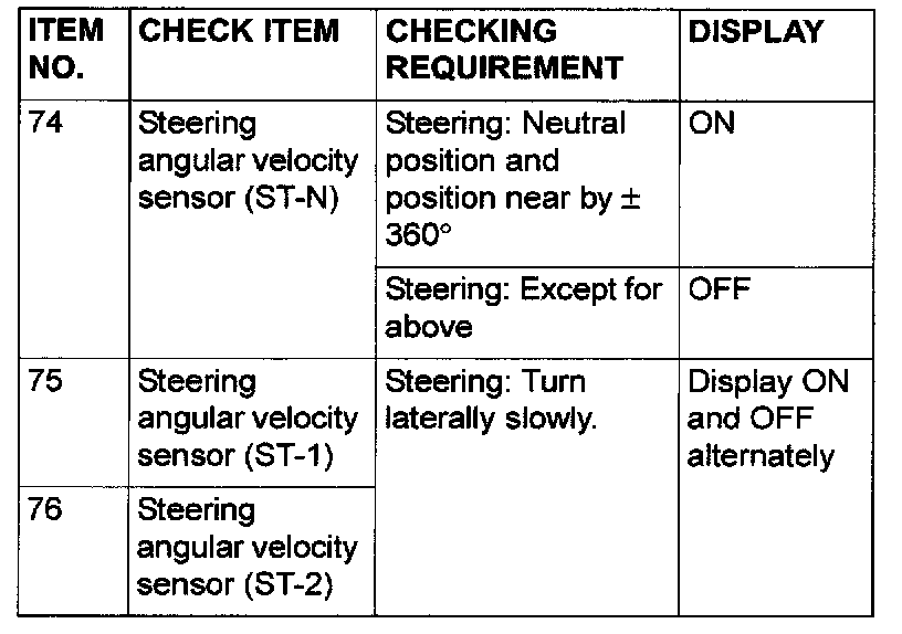 DTC 81 (ST-1), DTC 82 (ST-2) and DTC 83 (ST-N) are output if there is a fault in the steering angular velocity sensor' an open circuit or short circuit in the signal lines, or the internal circuit in the hydraulic unit and ABS-ECU is defective.